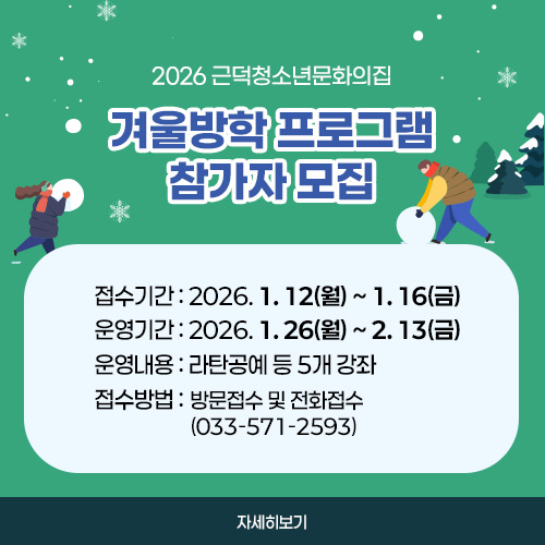 꿈과 희망의 충전소 청소년들의 꿈의 터전! 청소년교육문화 프로그램 청소년방학 프로그램 청소년자원봉사 청소년일터체험 청소년동아리 view more 행사일정 2026. 01 Sun Mon Tue Wed Thu Fri Sat 1 2 3 4 5 6 7 8 9 10 11 12 13 14 15 16 17 18 19 20 21 22 23 24 25 26 27 28 29 30 31 (목) 알림판 청소년 수련관모집 공고 자세히보기 자세히보기 공지/공고 행사교육 보도자료 2026 근덕청소년문화의집 겨울방학 프로그램 참가자 모집 2026-01-07 근덕청소년문화의집 작은 음악회 2025-10-17 2025 원덕청소년문화의집 하반기 교육문화 프로그램 참가자 모집 2025-08-02 2025년 근덕청소년문화의집 하반기 교육문화 프로그램 참가자 모집 2025-07-22 2025 원덕청소년문화의집 기획프로그램 [한여름 밤의 올빼미캠프] 참가자 모집 2025-07-02 2025년 근덕청소년문화의집 여름방학 프로그램 참가자 모집 2025-06-09 2025 원덕청소년문화의집 상반기 교육문화 프로그램 참가자 모집 2025-02-17 2025년 근덕청소년문화의집 특성화 프로그램 참가자 모집 2025-01-31 2025년 근덕청소년문화의집 상반기 교육문화 프로그램 참가자 모집 2025-01-31 원덕청소년문화의집 2025 겨울방학프로그램 참가자 모집 2024-12-18 근덕청소년문화의집 작은 음악회 2025-10-17 2019 원덕청소년문화의집 하반기 교육문화프로그램 운영 안내 2019-08-21 2019 원덕청소년문화의집 상반기 교육문화프로그램 참가자 모집 안내 2019-06-14 2017년 상반기 교육문화프로그램 참가자 모집공고 안내 2017-02-07 2019년 제2차 한민족 해외문화권 탐방활동(중국) 운영 2019-08-21 원덕청소년문화의집, 청소년 관련 공모사업 3개 부문 선정 2015-07-01 "강원도청소년활동진흥센터, 11월14일 우수기관 시상 격려" 2014-11-22 원덕청소년운영위원회 2014-11-22 2014 청소년자원봉사대회 원덕청소년운영위원회 강원도지사상 수상 2014-11-22 Click 포토갤러리 근덕 교육문화 프라모델 및 미니어처 근덕 교육문화 요리 근덕 교육문화 ITQ 엑셀 자격증반 근덕 교육문화 토탈공예 근덕 교육문화 슬기로운 요리 쿡 근덕 교육문화 재미있는 미술교실 준비중입니다.
