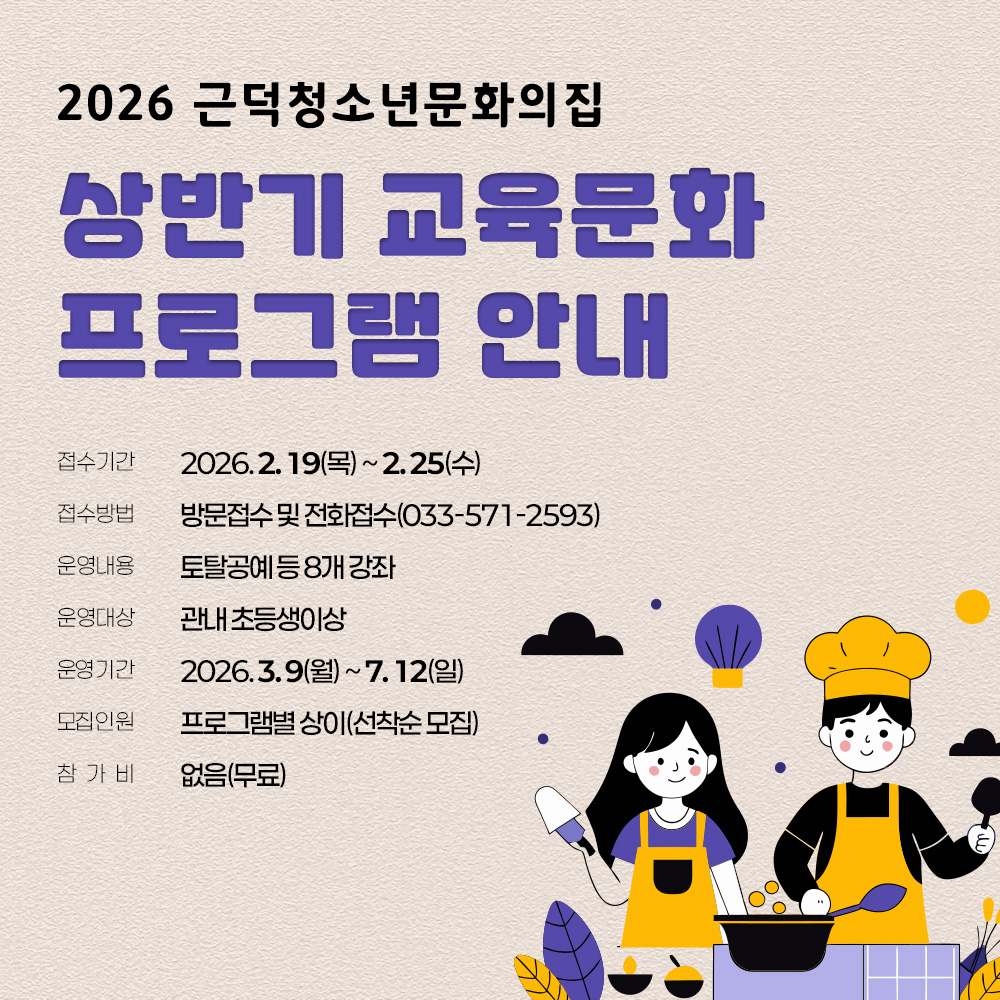 꿈과 희망의 충전소 청소년들의 꿈의 터전! 청소년교육문화 프로그램 청소년방학 프로그램 청소년자원봉사 청소년일터체험 청소년동아리 view more 행사일정 2026. 02 Sun Mon Tue Wed Thu Fri Sat 1 2 3 4 5 6 7 8 9 10 11 12 13 14 15 16 17 18 19 20 21 22 23 24 25 26 27 28 (목) 알림판 청소년 수련관모집 공고 자세히보기 공지/공고 행사교육 보도자료 2026 근덕청소년문화의집 상반기 교육문화 프로그램 참가자 모집 2026-02-09 2026 근덕청소년문화의집 미리설 가족체험 프로그램 참가자 모집 2026-01-28 2026 근덕청소년문화의집 겨울방학 프로그램 참가자 모집 2026-01-07 근덕청소년문화의집 작은 음악회 2025-10-17 2025 원덕청소년문화의집 하반기 교육문화 프로그램 참가자 모집 2025-08-02 2025년 근덕청소년문화의집 하반기 교육문화 프로그램 참가자 모집 2025-07-22 2025 원덕청소년문화의집 기획프로그램 [한여름 밤의 올빼미캠프] 참가자 모집 2025-07-02 2025년 근덕청소년문화의집 여름방학 프로그램 참가자 모집 2025-06-09 2025 원덕청소년문화의집 상반기 교육문화 프로그램 참가자 모집 2025-02-17 2025년 근덕청소년문화의집 특성화 프로그램 참가자 모집 2025-01-31 근덕청소년문화의집 작은 음악회 2025-10-17 2019 원덕청소년문화의집 하반기 교육문화프로그램 운영 안내 2019-08-21 2019 원덕청소년문화의집 상반기 교육문화프로그램 참가자 모집 안내 2019-06-14 2017년 상반기 교육문화프로그램 참가자 모집공고 안내 2017-02-07 2019년 제2차 한민족 해외문화권 탐방활동(중국) 운영 2019-08-21 원덕청소년문화의집, 청소년 관련 공모사업 3개 부문 선정 2015-07-01 "강원도청소년활동진흥센터, 11월14일 우수기관 시상 격려" 2014-11-22 원덕청소년운영위원회 2014-11-22 2014 청소년자원봉사대회 원덕청소년운영위원회 강원도지사상 수상 2014-11-22 Click 포토갤러리 근덕 교육문화 프라모델 및 미니어처 근덕 교육문화 요리 근덕 교육문화 ITQ 엑셀 자격증반 근덕 교육문화 토탈공예 근덕 교육문화 슬기로운 요리 쿡 근덕 교육문화 재미있는 미술교실 준비중입니다.
